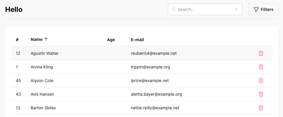 As you can see on the existing users/index.blade.php example component you can already sort and filter, but the data is hardcoded. Let's fix it now!
